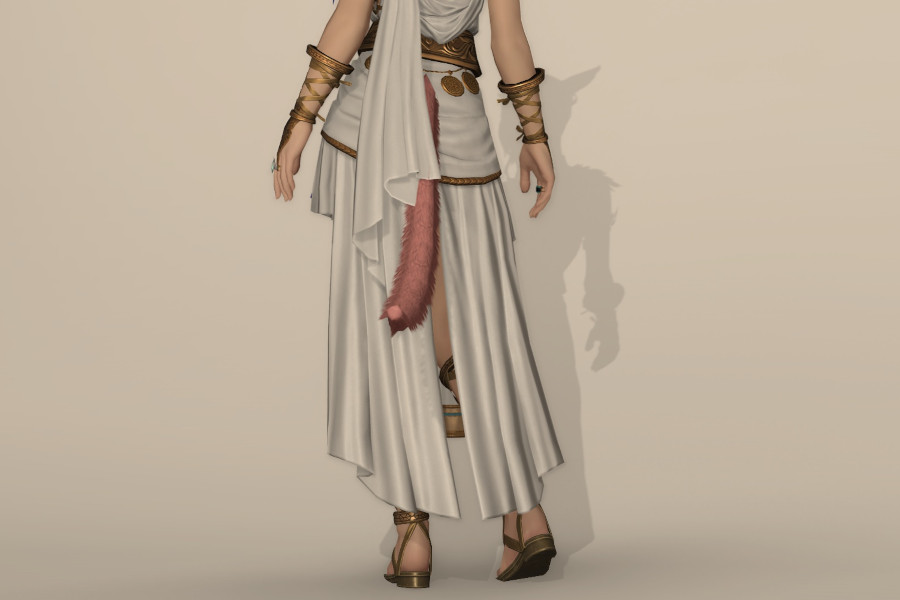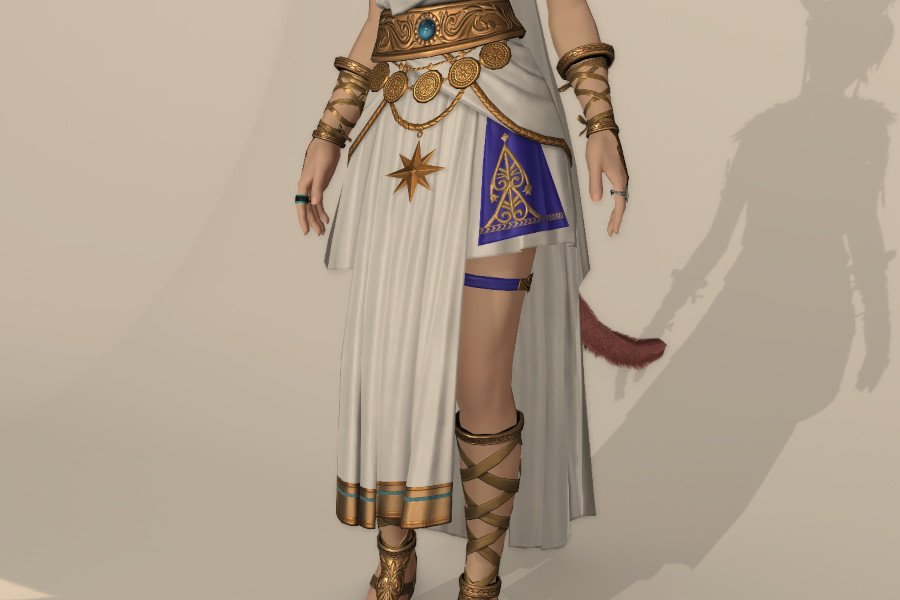 流れるような布をまとい、金属製の装飾で締めています。